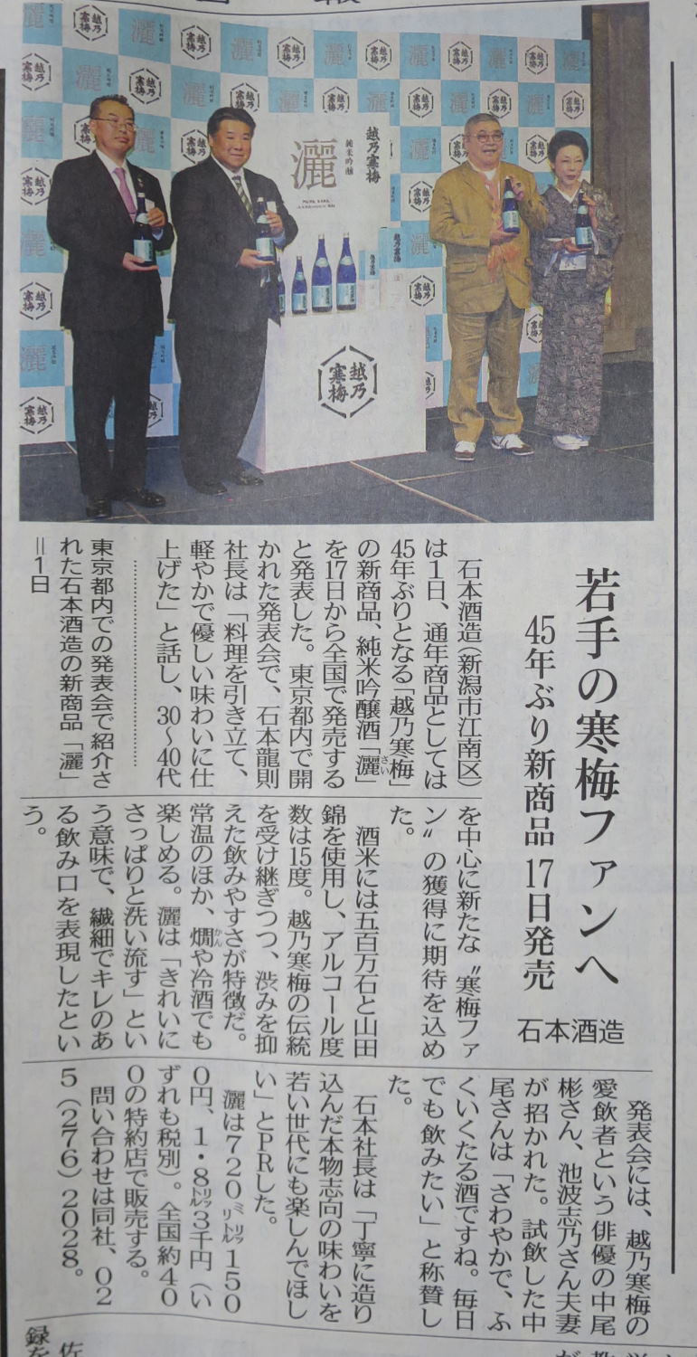 ・石本酒造(新潟市江南区)は「越乃寒梅(こしのかんばい)」の新商品「純米吟醸 灑(さい)」を発売する。