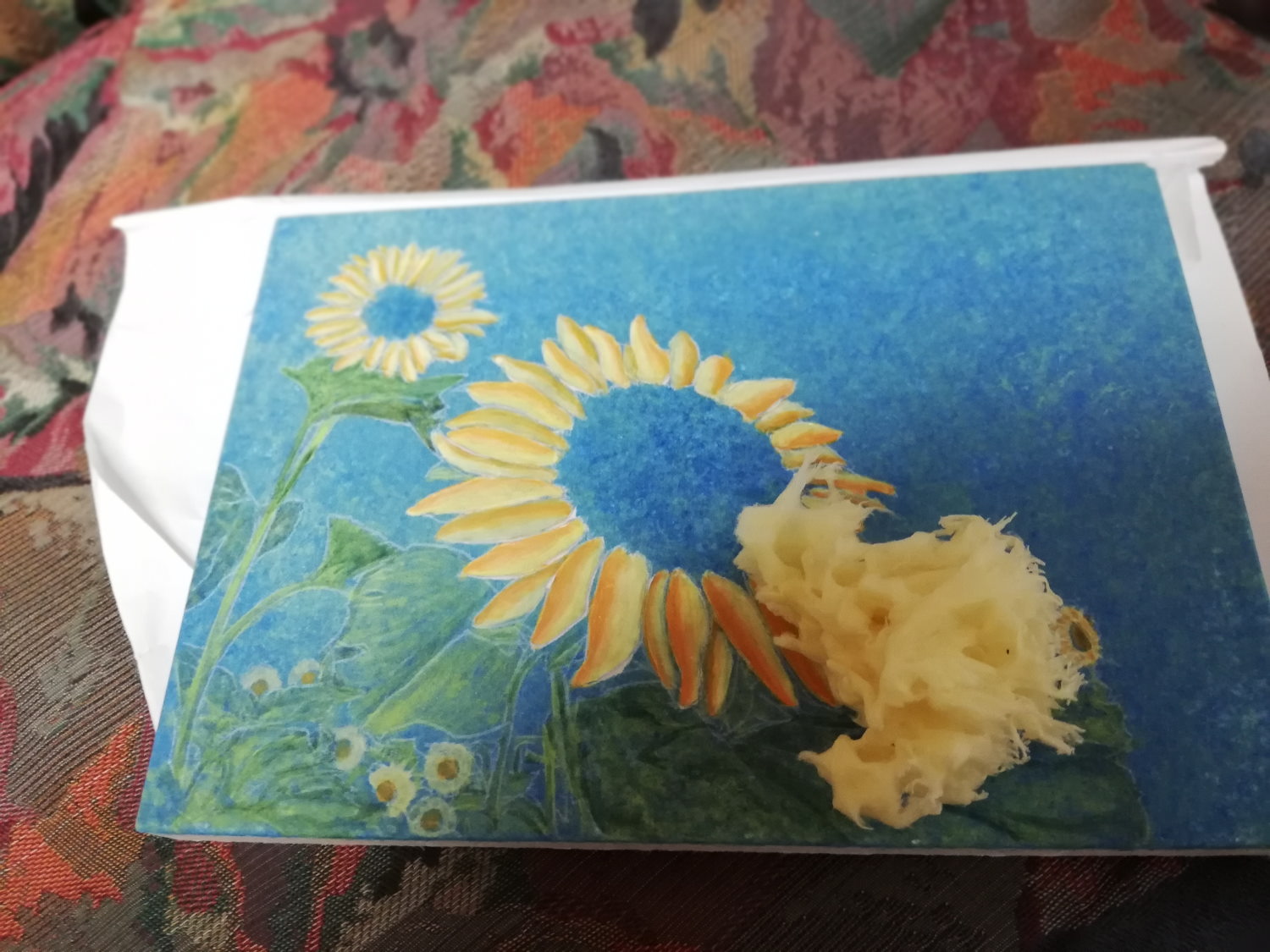 背景と、ひまわりの黄色い部分以外は、この日のみで描きました。